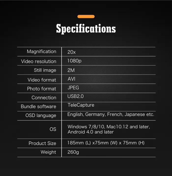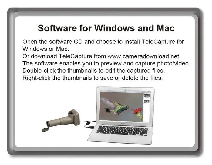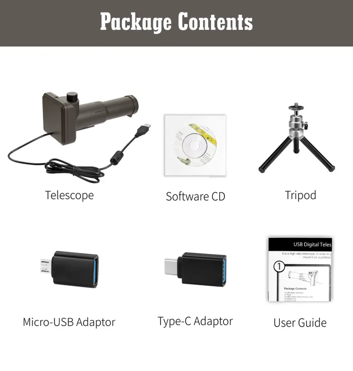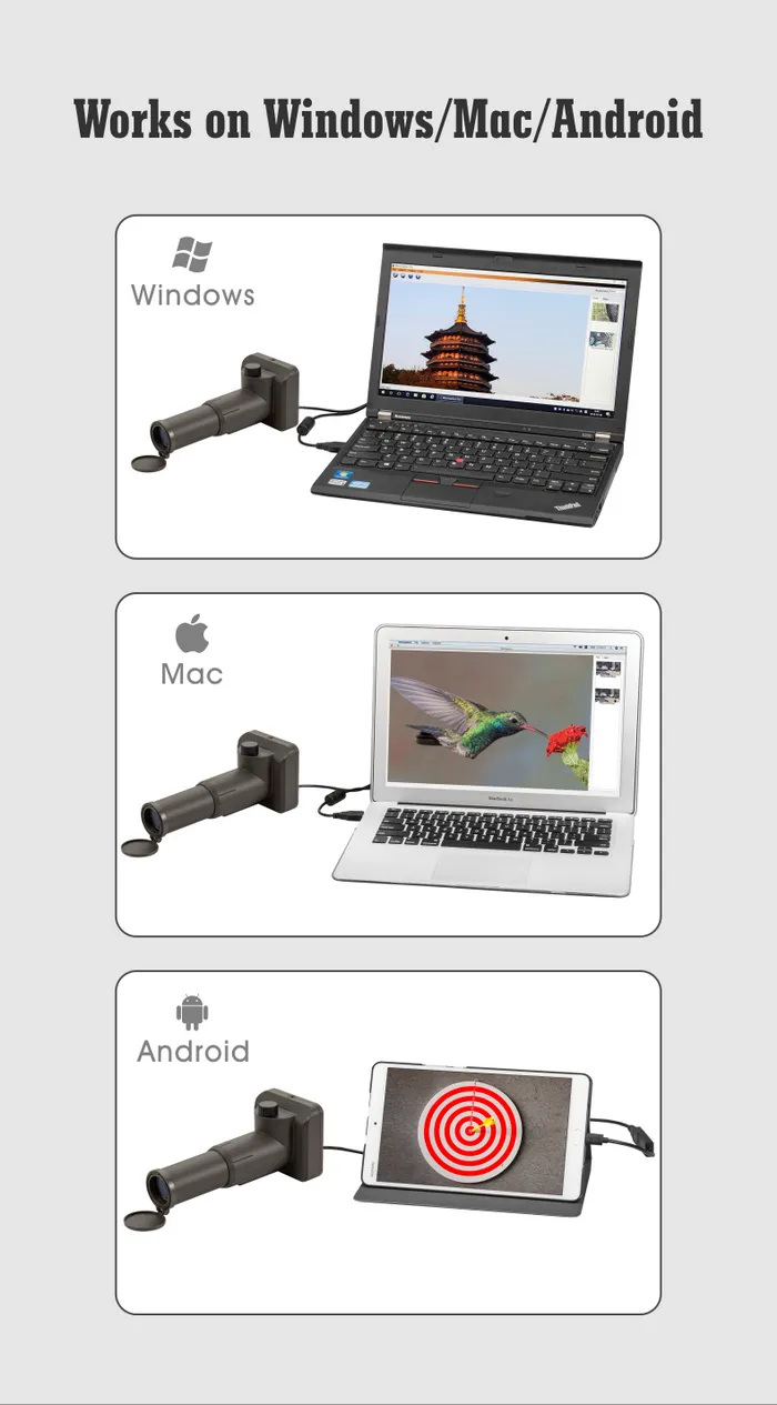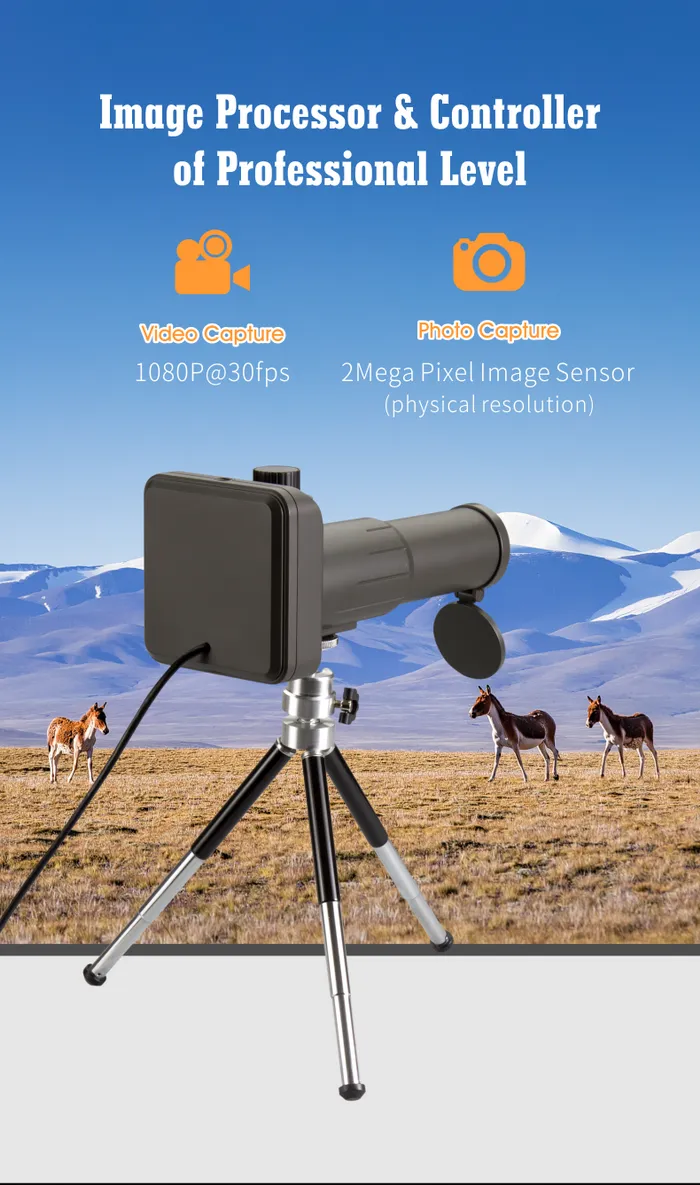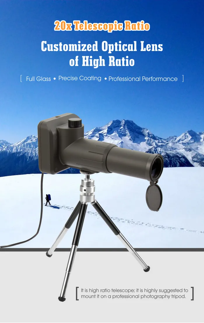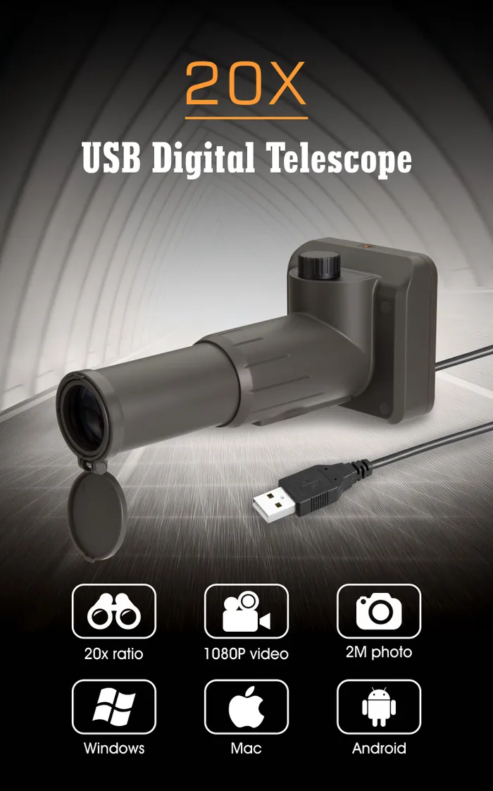 The 20x USB Digital Telescope is a portable and easy to operate (plug to play) USB Digital telescope & Spotting Scope & Monocular camera that allows you to see what in the distance on computer (Windows & Mac) and Android devices by USB connection. It enables you to capture stunning 1080p video and 2M photo so easy.