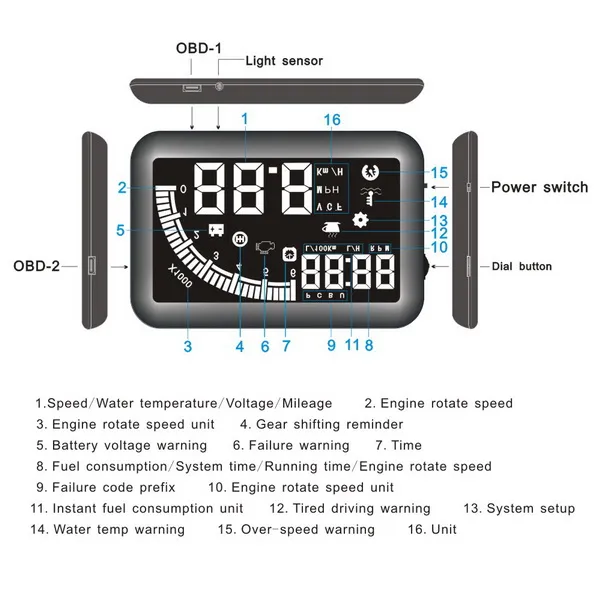 * Display engine speed, speed, voltage, temperature, fuel consumption and other information on the front windshield of the driver's eye level.