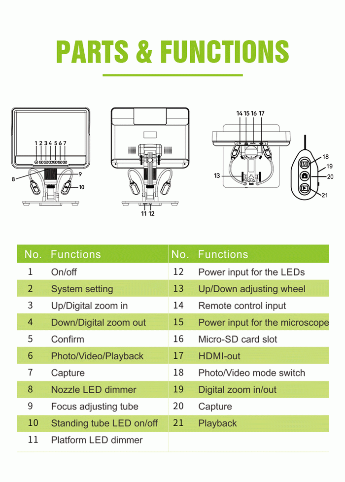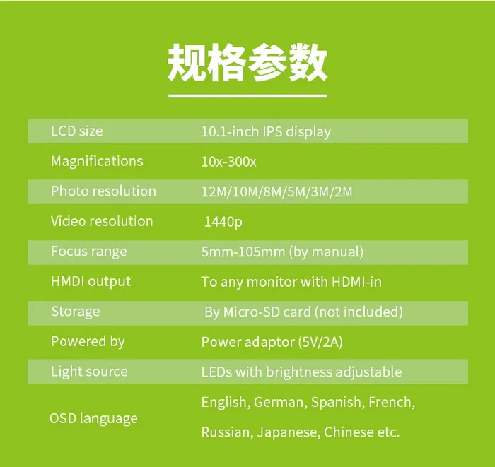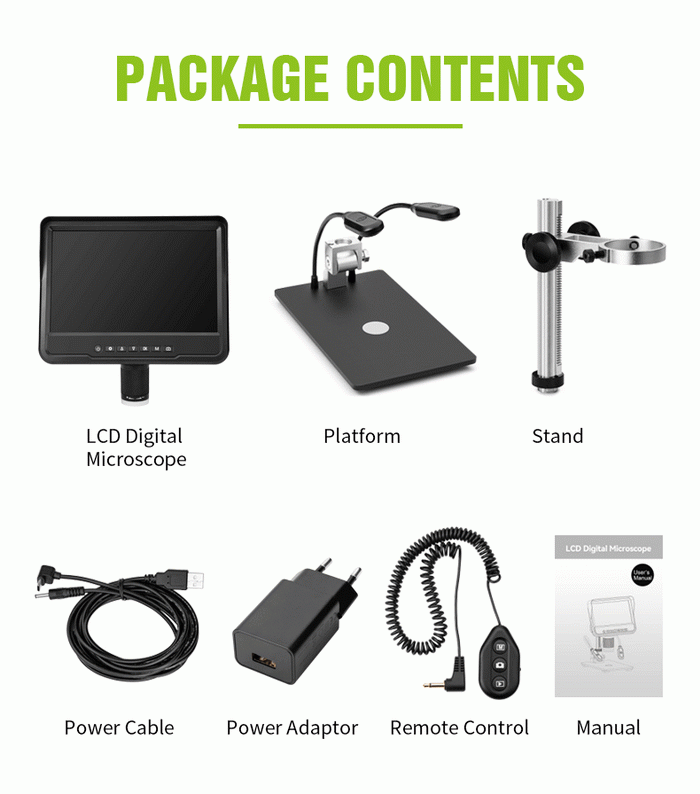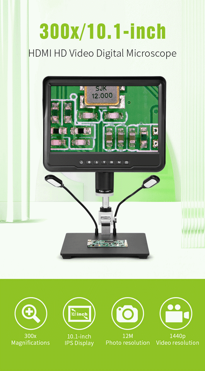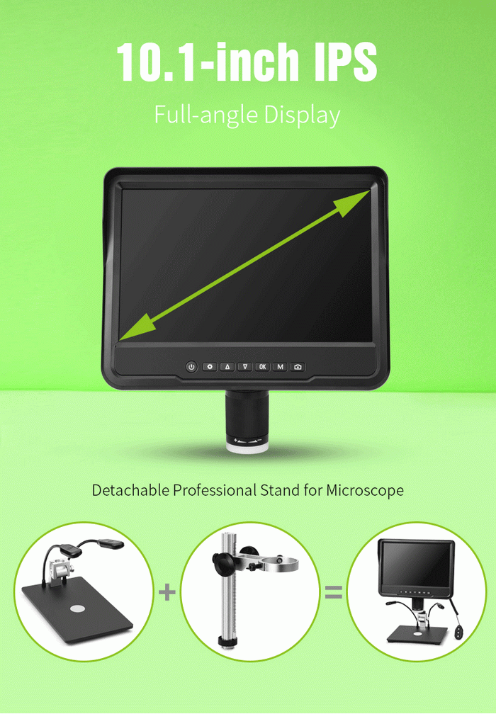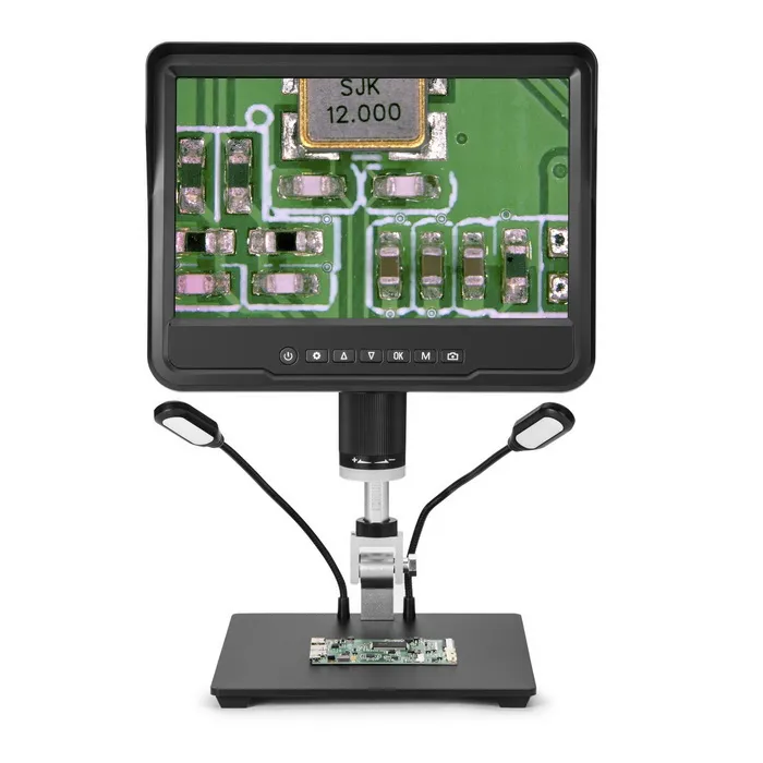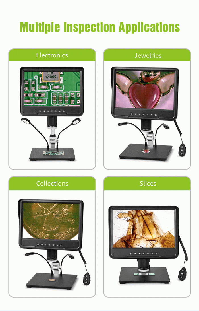 The Standalone 10.1-inch LCD Digital Microscope enables you to inspect electronics, PCB circuits, coins, stamps, fabrics, biological specimen slices, etc. Its high magnification rates ensure you see the very details of the objects.