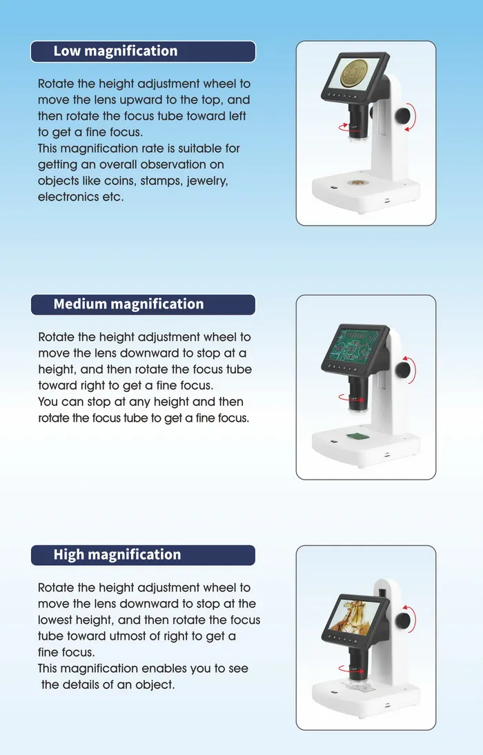 The Standalone 5-inch LCD Digital Microscope with Polarizer enables you to observe tiny objects like coins, stamps, fabrics, electronics, PCB circuits and biological specimen slices etc. Its polarizing filter, able to reduce glare, is especially useful for objects with shiny surface like diamond, jewelry metal etc.
